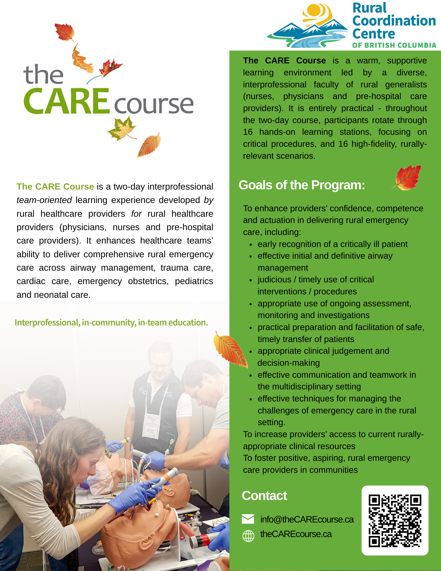 The CARE Coursesupported through the Rural Coordination Centre of BC, strives to provide a FUN, WARM, SUPPORTIVE educational experience that will improve the confidence and competence of rural emergency care providers across Canada.